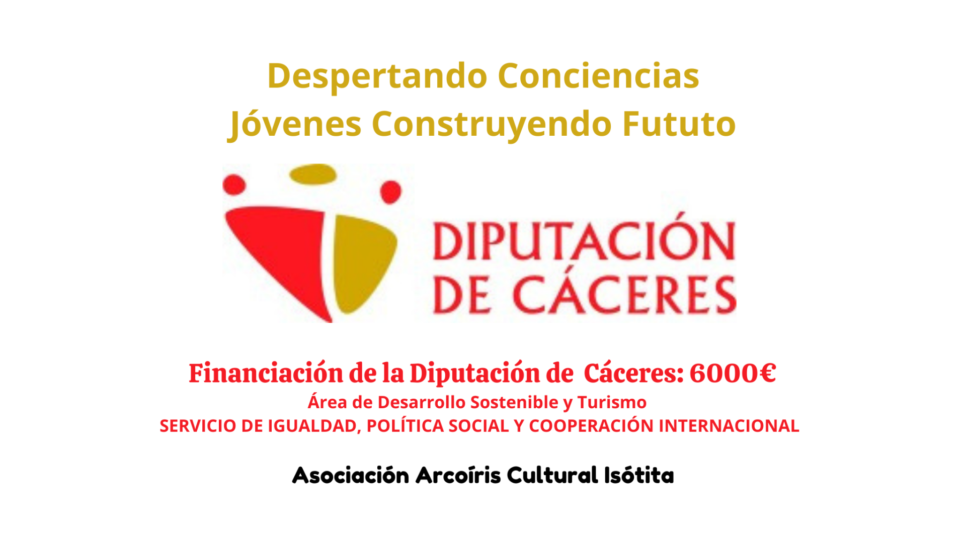 Nos hace mucha ilusión anunciar que la Diputación de Cáceres ha seleccionado nuestra iniciativa "Despertando Conciencias, Jóvenes Construyendo Futuro" dentro de su línea de ayudas, otorgándonos una subvención de 6.000€.
